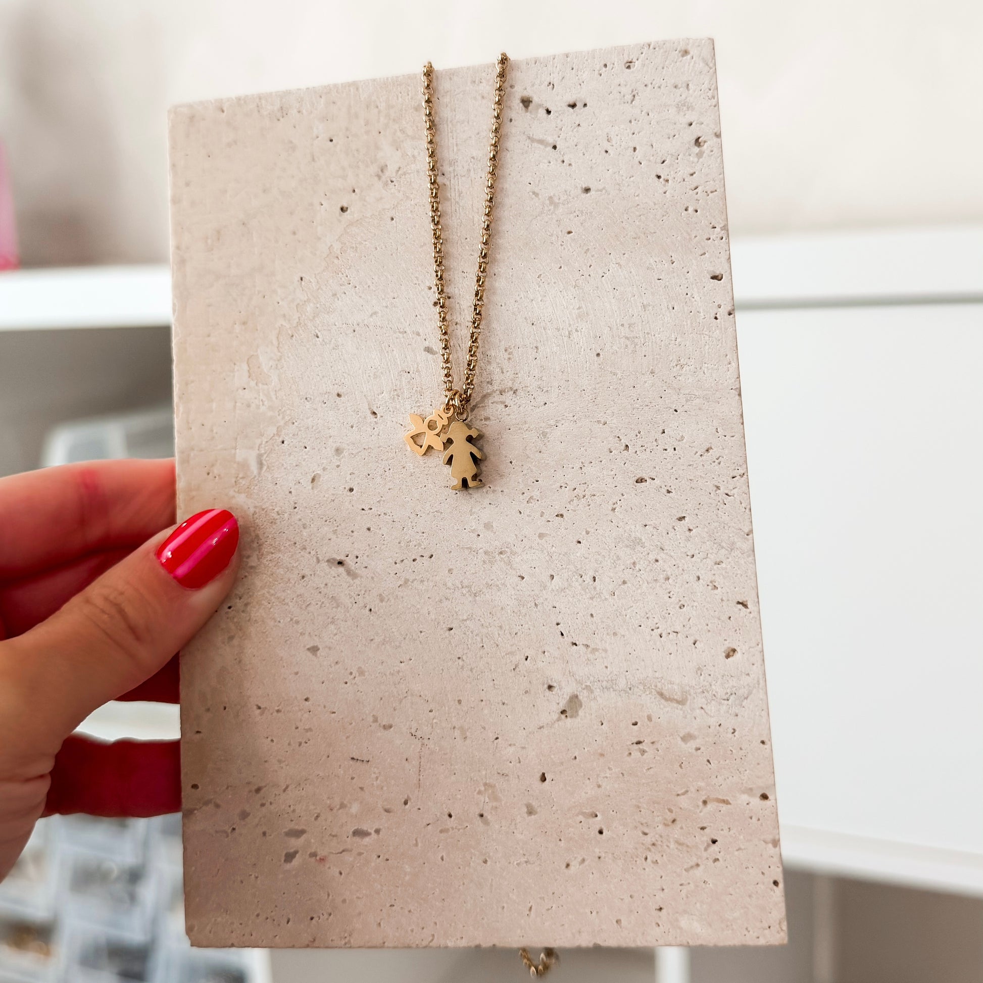 Este diseño en acero inoxidable dorado incluye dos charms minimalistas que representan ternura, conexión y amor. Su tamaño compacto lo hace perfecto para usar todos los días, combinar con otros collares o regalar a alguien especial.