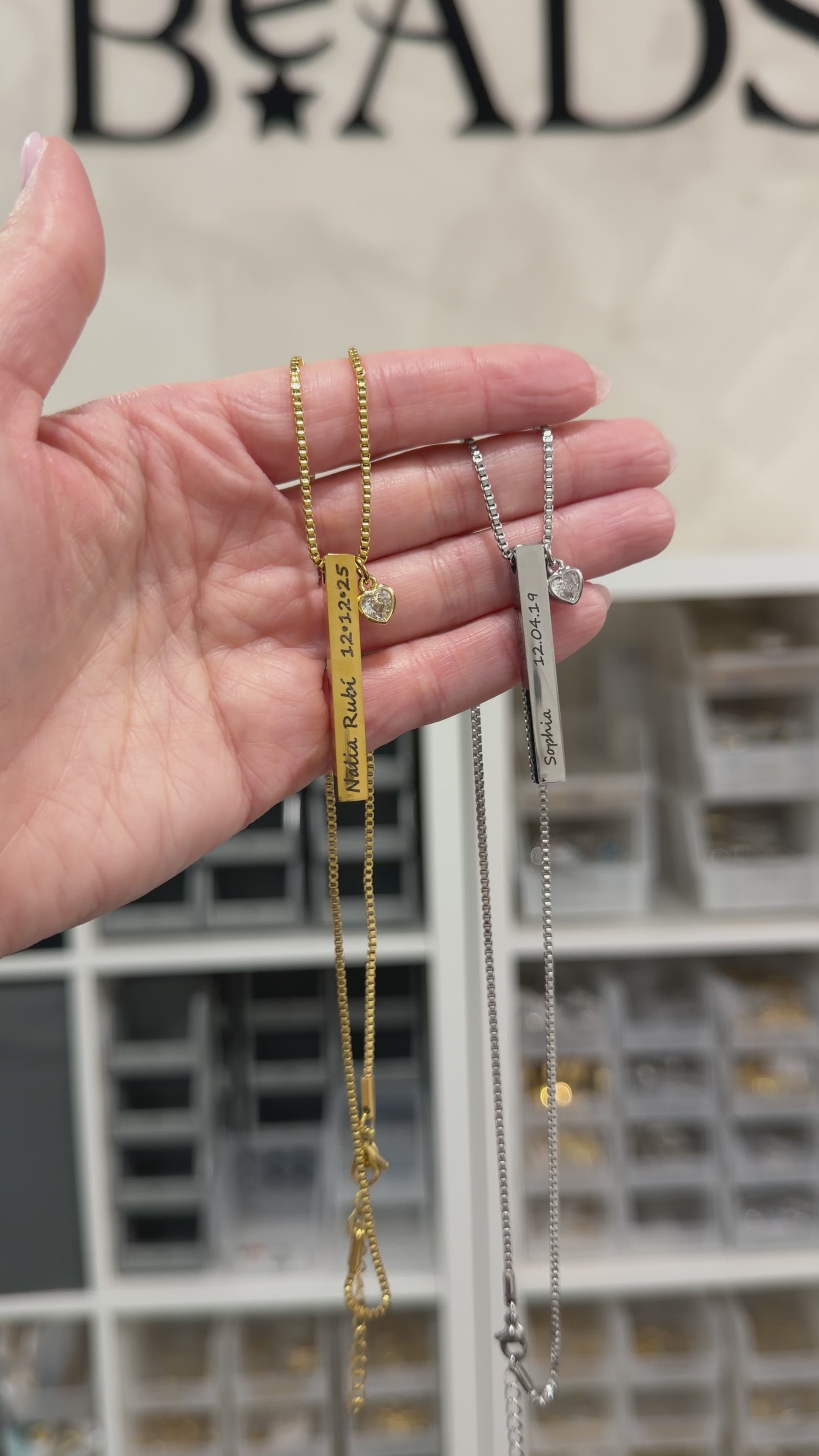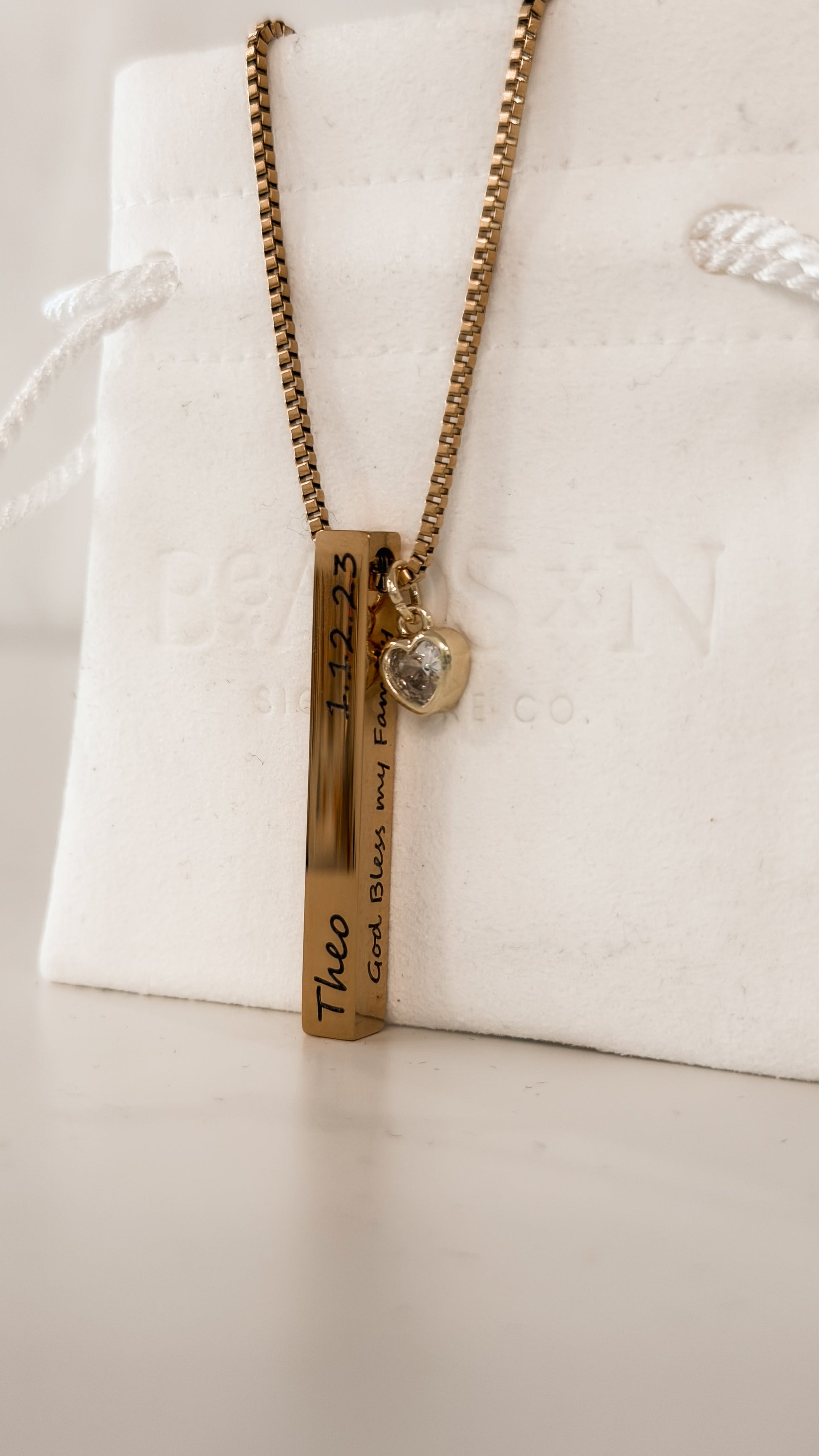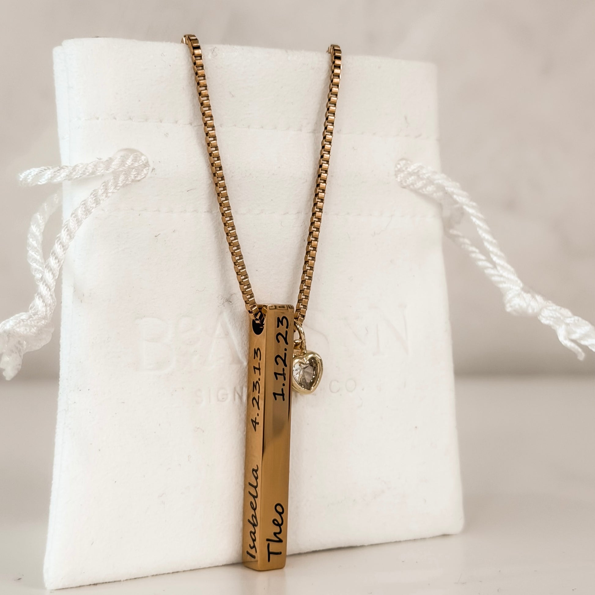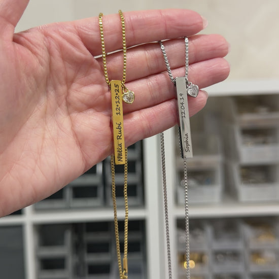 Este hermoso collar de barras verticales es una pieza cargada de significado y amor. Personalízalo con hasta 4 nombres y fechas de nacimiento, convirtiéndolo en un recuerdo único que honra a las personas más importantes de tu vida.