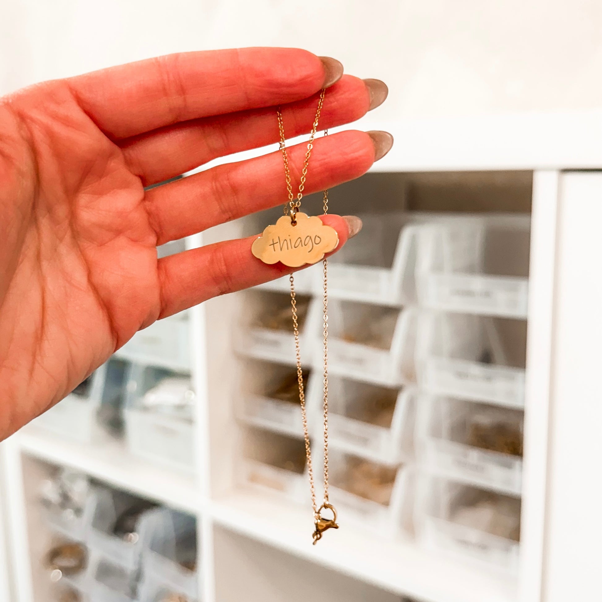 Este delicado collar presenta un hermoso dije en forma de nube, elaborado en acero inoxidable con acabado dorado, perfecto para llevar un nombre especial siempre contigo. El grabado personalizado le da un toque único y significativo, convirtiéndolo en el regalo ideal para cumpleaños, mamás, bebés o cualquier ocasión especial.