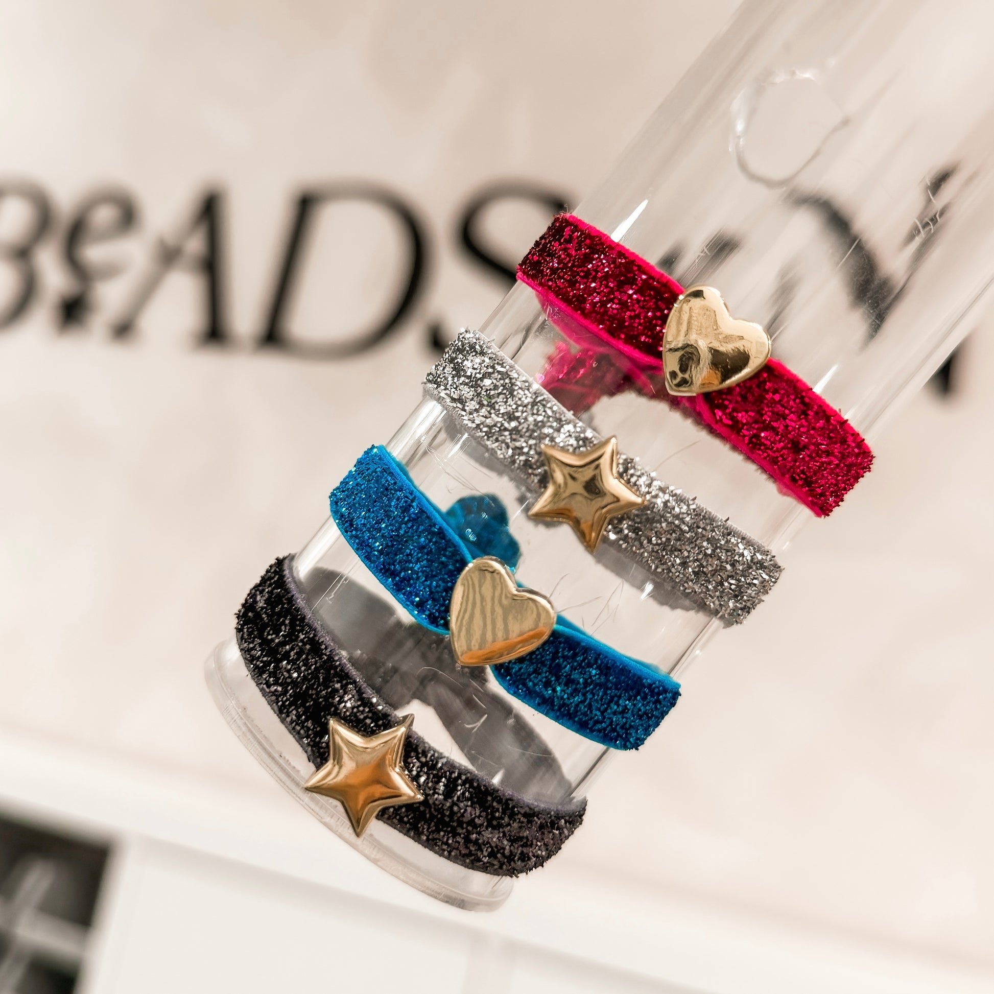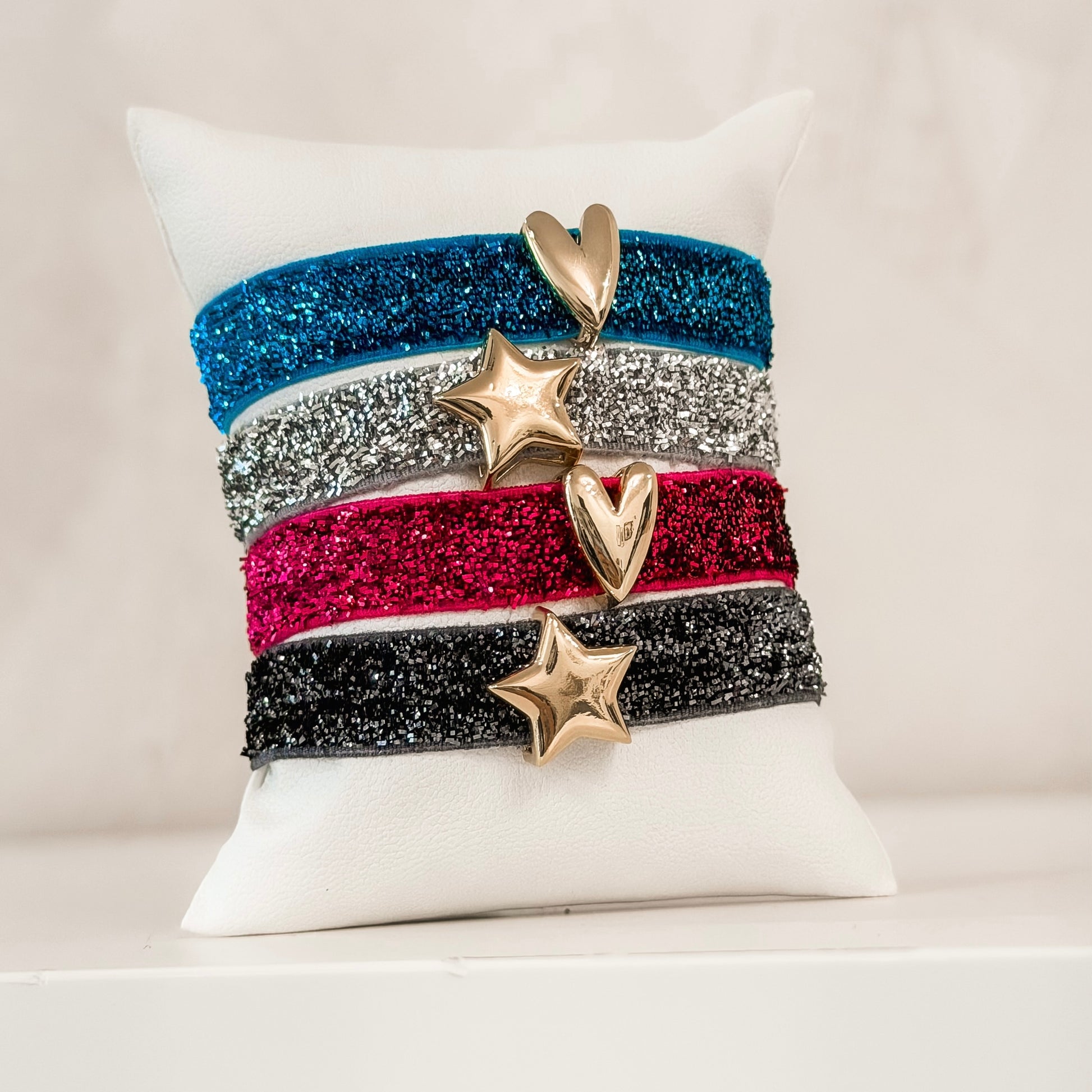 Dale un toque brillante a tu estilo con estas pulseras elásticas llenas de color y brillo. Puedes personalizarlas eligiendo entre charm de estrella o corazón en tono dorado, y escoger tu color favorito: turquesa, magenta, plata o azul.